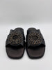 Effortless chic meets comfort these flat leather sandals by Exé feature a sleek silhouette, soft cushioned footbed, and a sparkling brooch detail for a touch of glamour in every step.